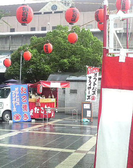 地元の駅前の広場にて夏祭りは開催されました。大きな櫓も建てられ、ヨーヨー釣りや射的などの露店も出てていました。当日は夏祭りの始まる2時間ほど前まで雨が降っていました。そのため、路面などは濡れていましたが、なんとか天候は回復し蒸し暑い中でしたが、無事に開催されました。