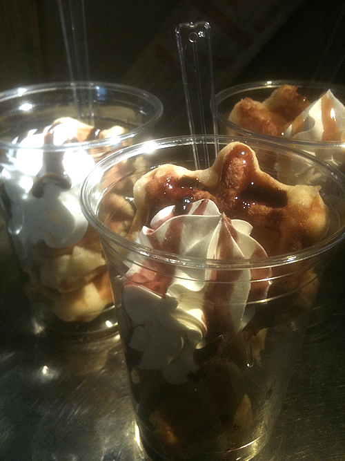1日300食、3日間合計で900食のワッフルをご発注いただきました。味は1種類ではなく、チョコ、メープル、キャラメル、ホイップなどの中からお客様にお好きなものをお選びいただき、アツアツ出来たてのワッフルにかけてご提供しました。